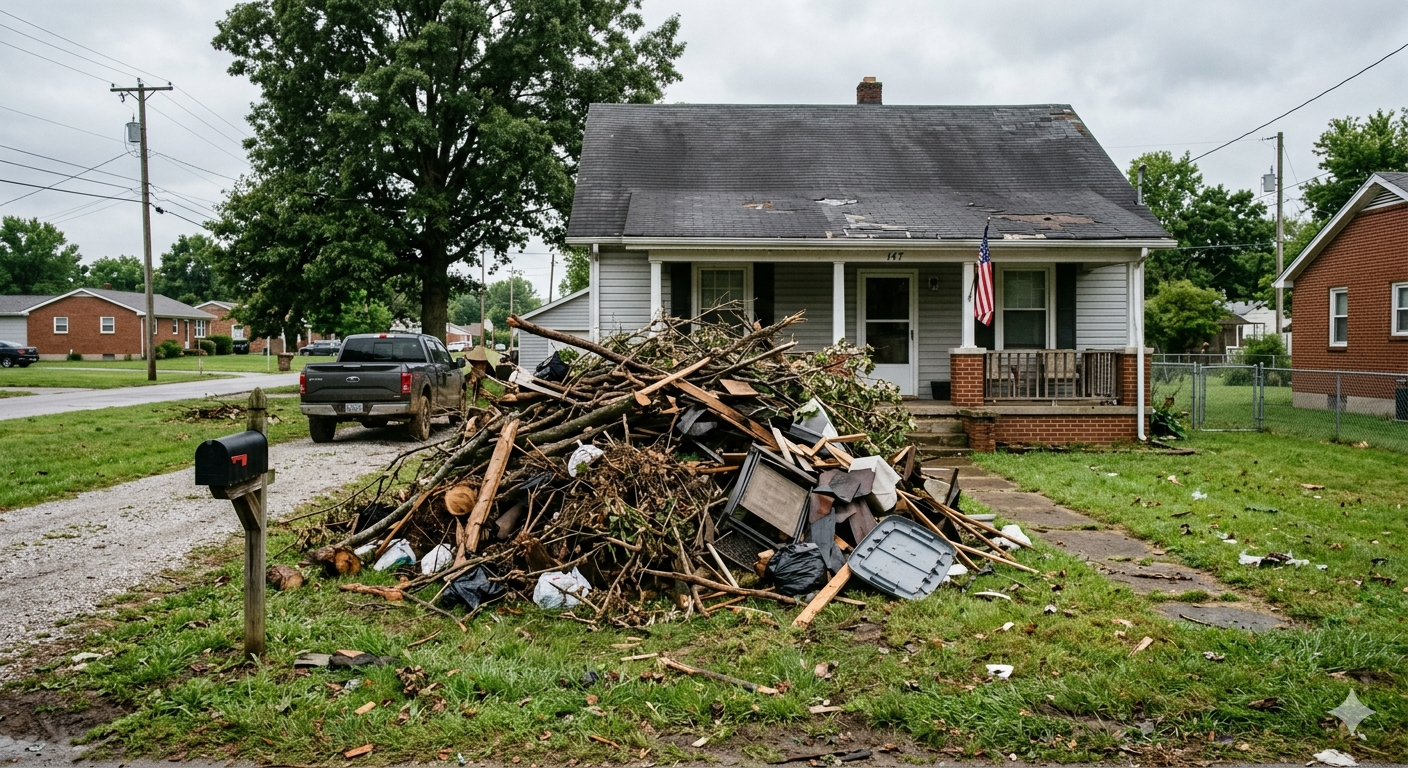 Dunn Right Junk Removal LLC handles storm debris removal in Glendale, Leitchfield, Elizabethtown, and surrounding areas when fallen branches, damaged roofing materials, and outdoor clutter create safety hazards or block driveways and walkways. After severe weather moves through, debris left on your property can damage landscaping, create tripping hazards, or prevent vehicles and equipment from accessing your home or business. Fast response becomes critical when debris blocks entry points or when damaged materials continue to deteriorate and spread across your yard.